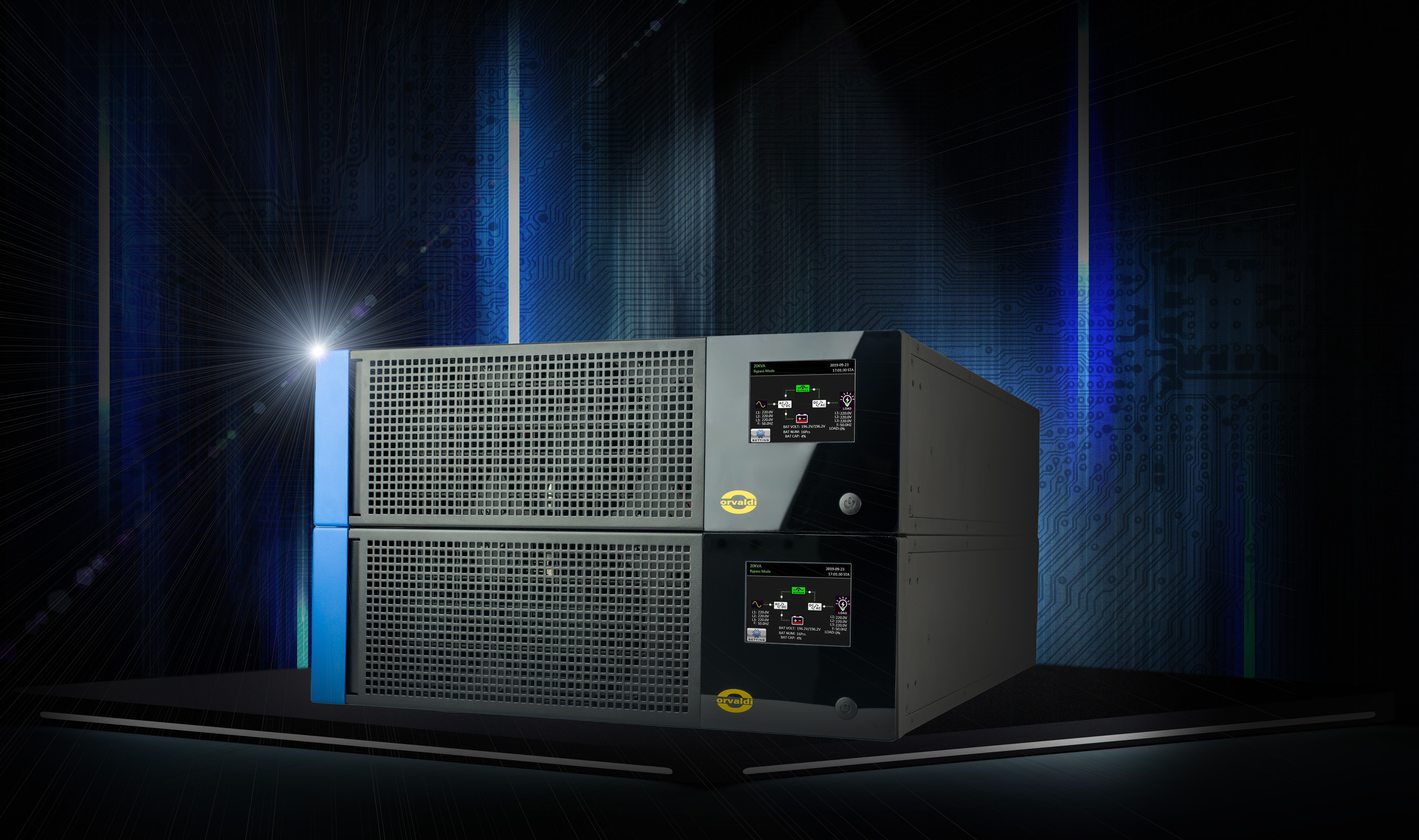 Porównanie ORVALDI V10KRT, V15KRT i V20KRT: topologia on-line VFI, pf=1.0, 0 ms przełączenia, praca 3f-3f/3f-1f, obudowa rack...
